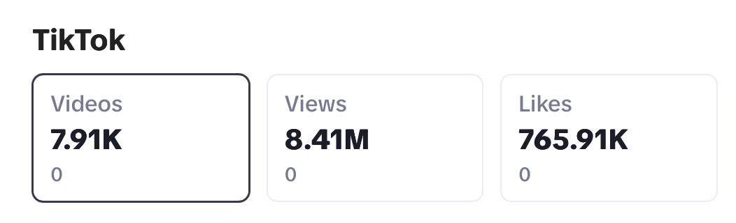 TikTok Performance: Almost 8K videos, 8M total views, 765K likes, 469K shares, and 45K comments – with content categories led by singing, dancing, and lip-syncing.